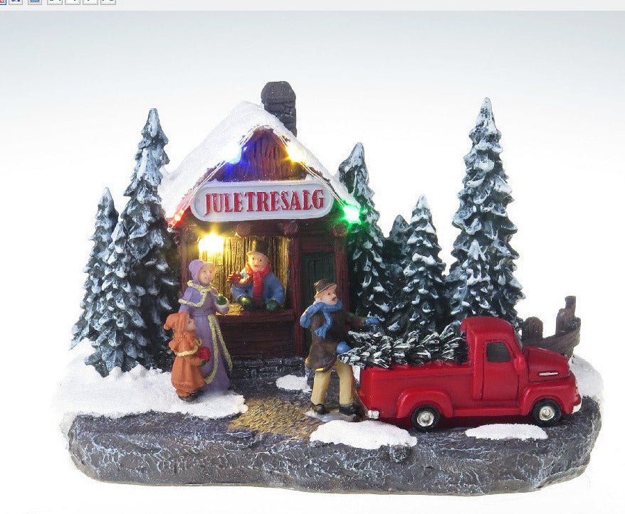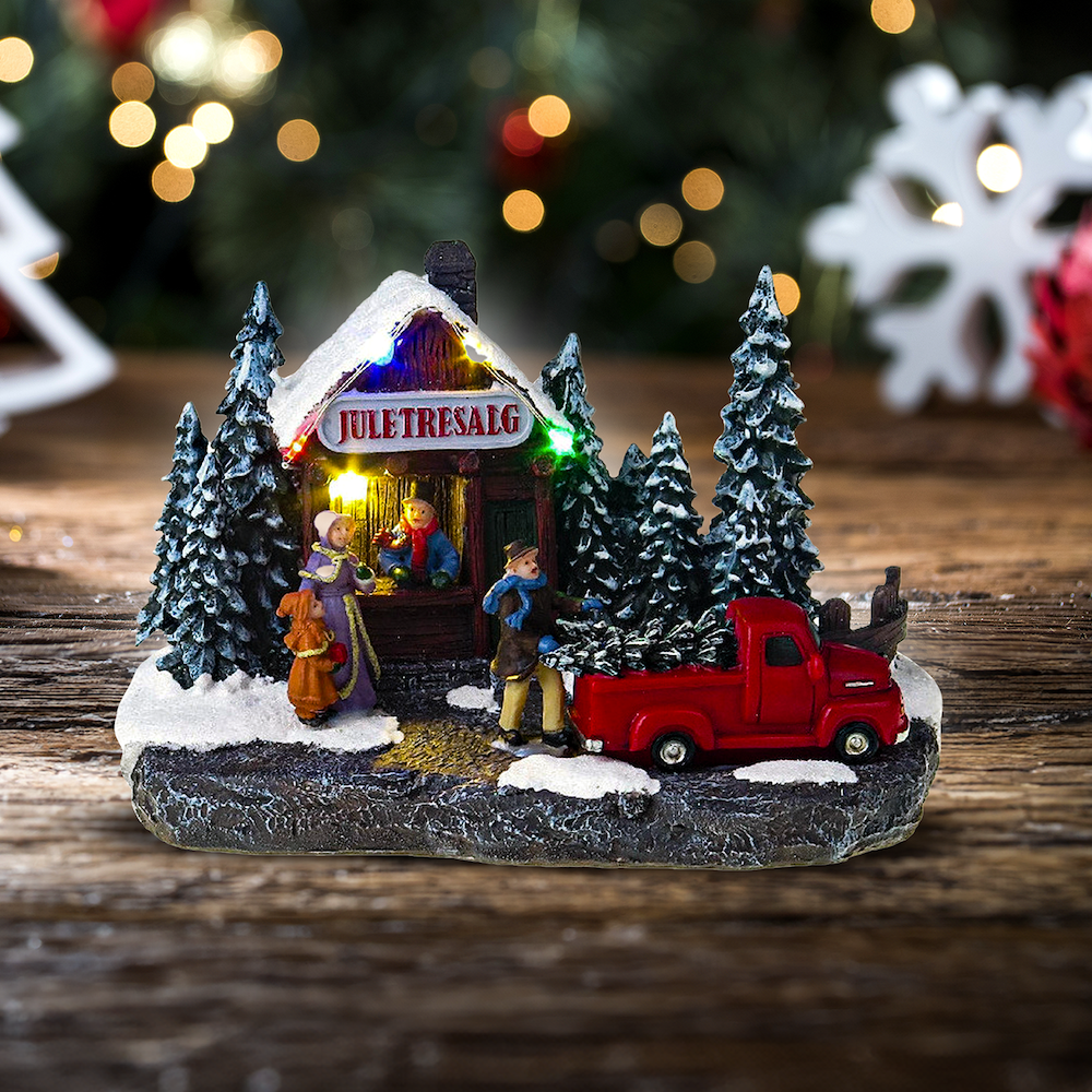 Tuo vilkkaaseen lumoa Joulumarkkinat joulukylällesi LED-valaistujen joulukuusitalliemme avulla. Tässä ihastuttavassa sisustuksessa on kodikas kioski, jota koristavat vilkkuvat LED-valot.