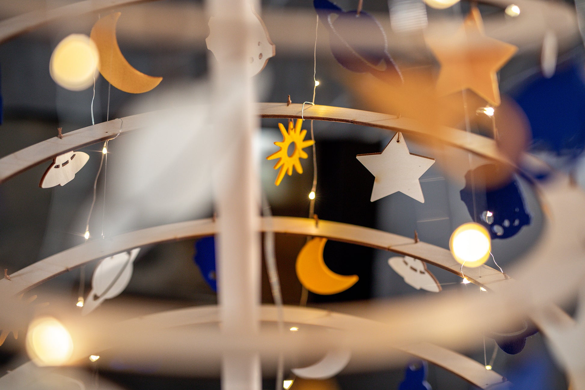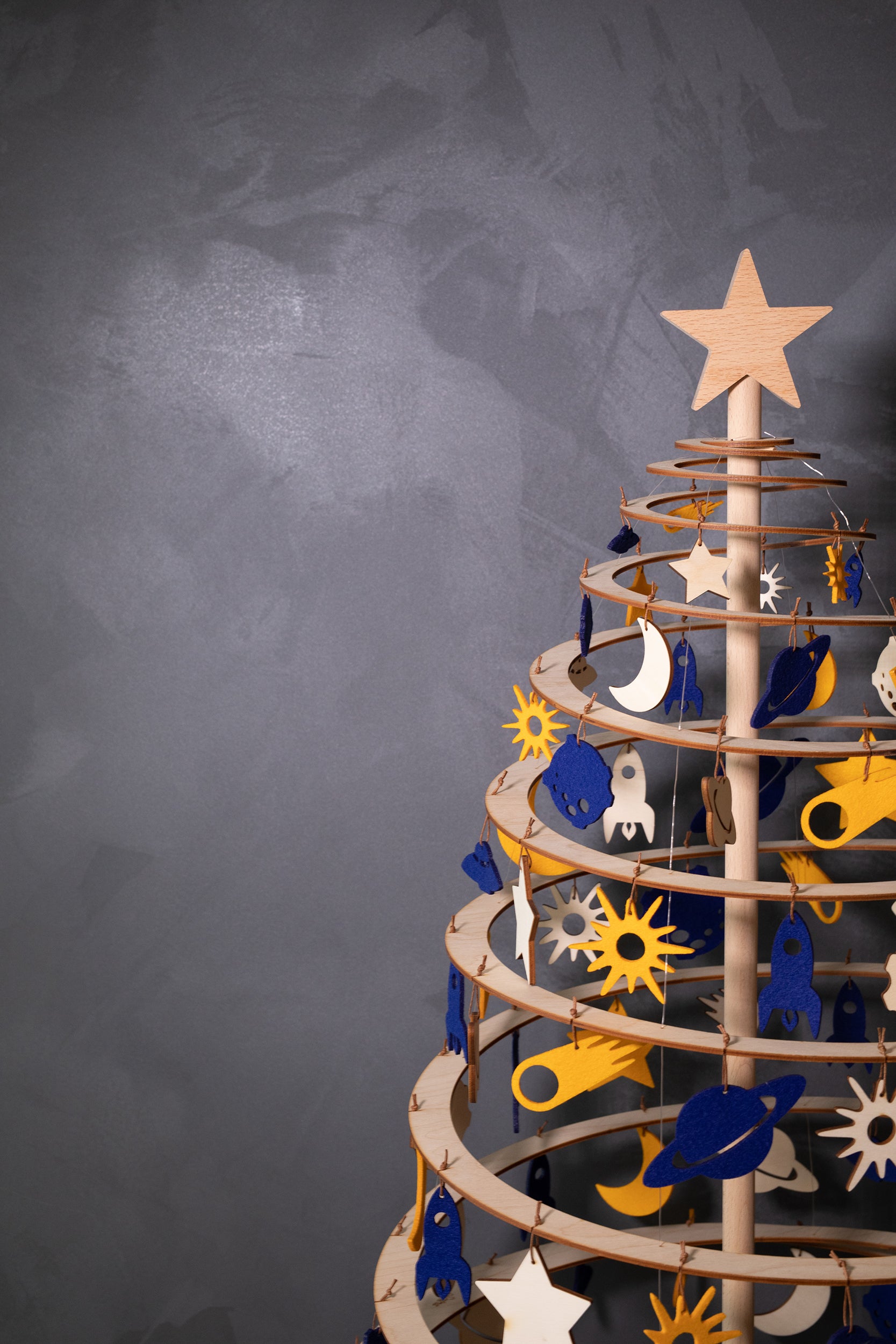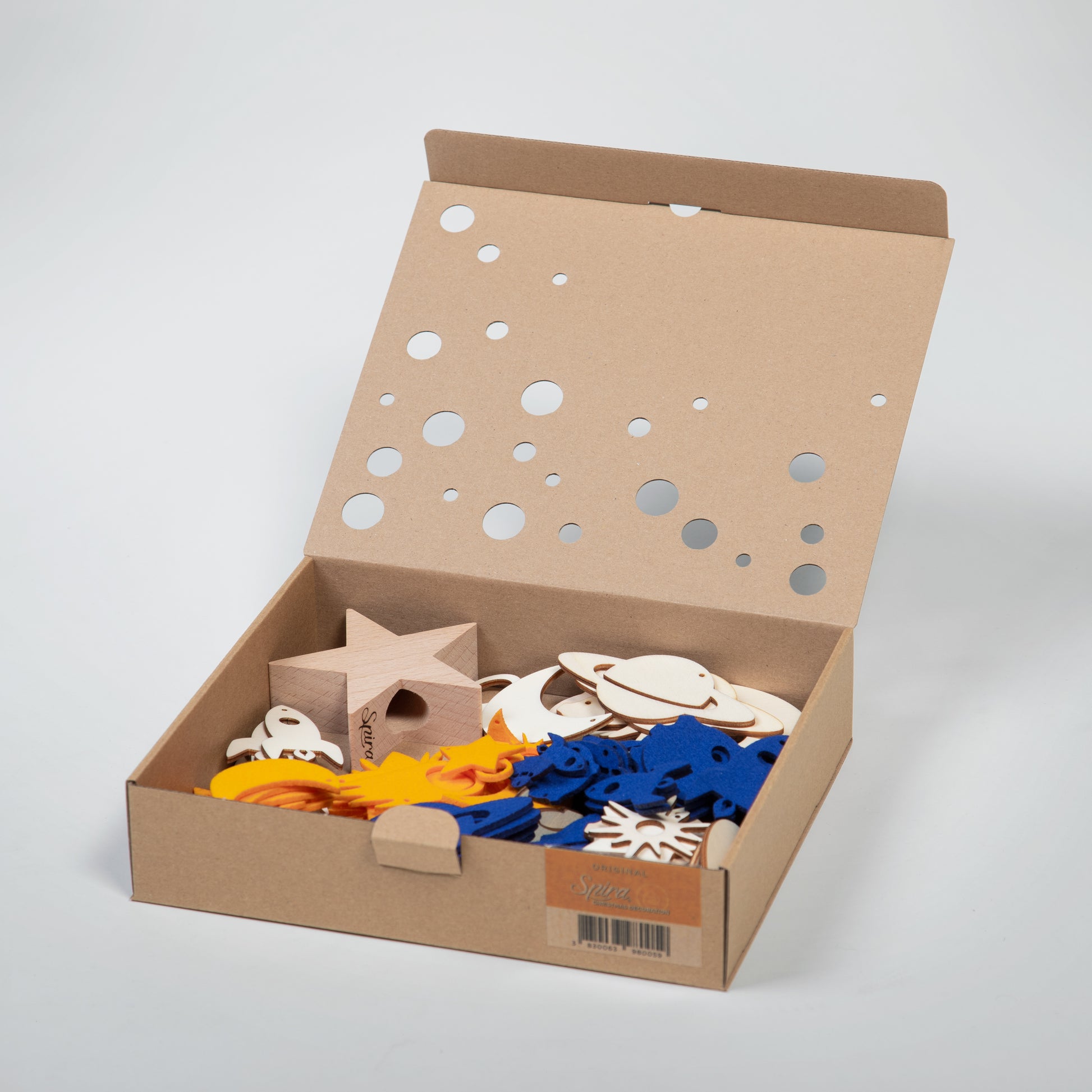 Setti sisältää puisen tähtivarren ja sopivan määrän sinisestä ja keltaisesta huovasta ja puusta tehtyjä koristeita. Mukana ripustusnauhat.