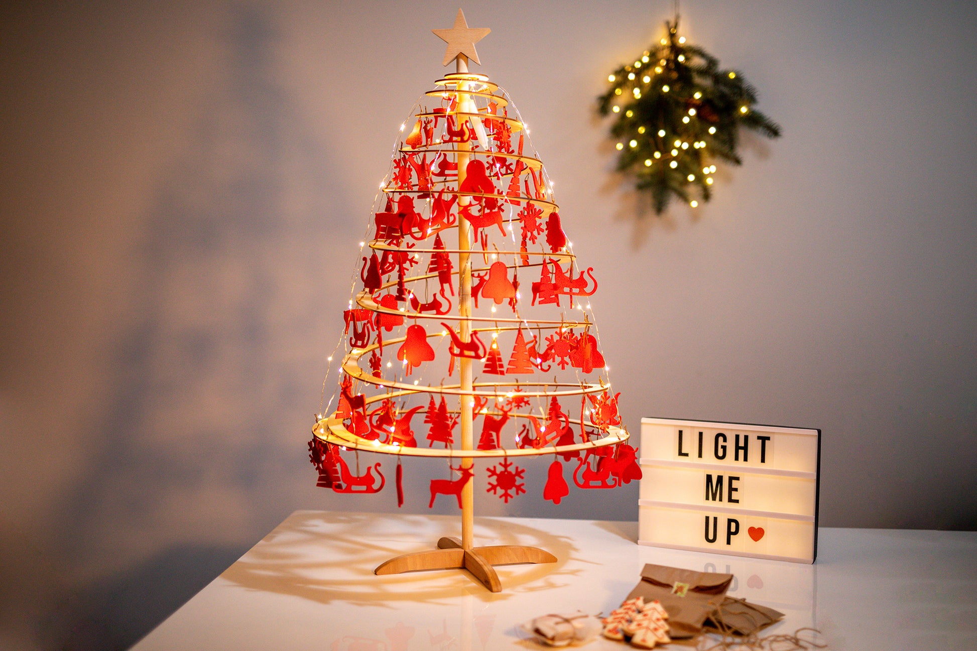 Tämä ympäristöystävällinen joulukuusi on valmistettu laserleikatusta vanerista ja siinä on puinen jalusta. Puinen kuusi on nopea koota ja purkaa. Se mahdollistaa myös kätevän säilytyksen 4 cm korkeassa box.This tuote ei sisällä koristeita.