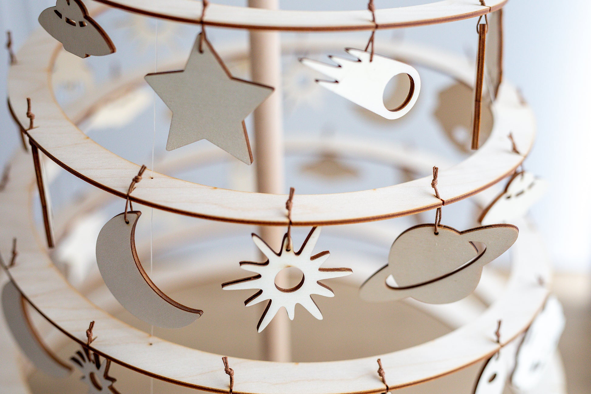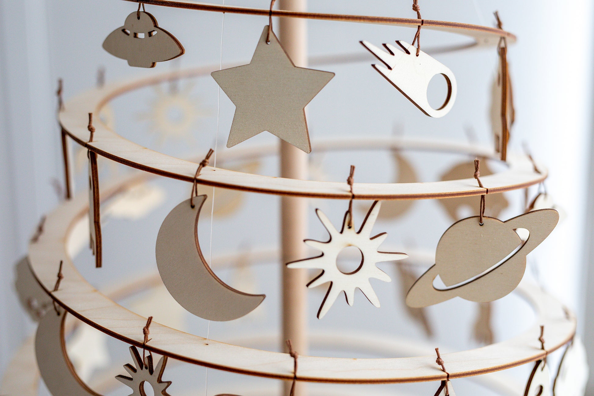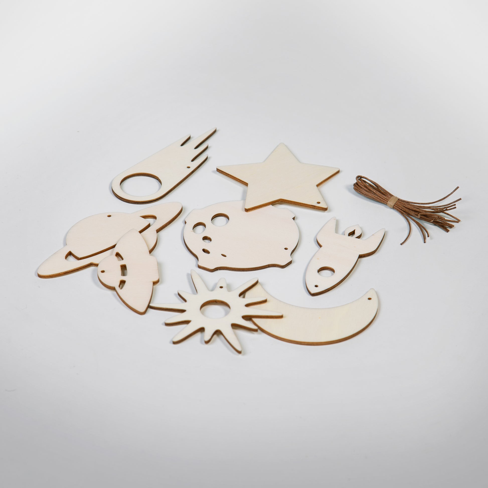 Erimuotoisten avaruusaiheisten puukoristeiden sarja on erinomainen valinta moderniin ja klassiseen sisustukseen. Ajaton muotoilu ja puun lämpö takaavat täydellisen joulukoristeen jokaiseen kotiin.