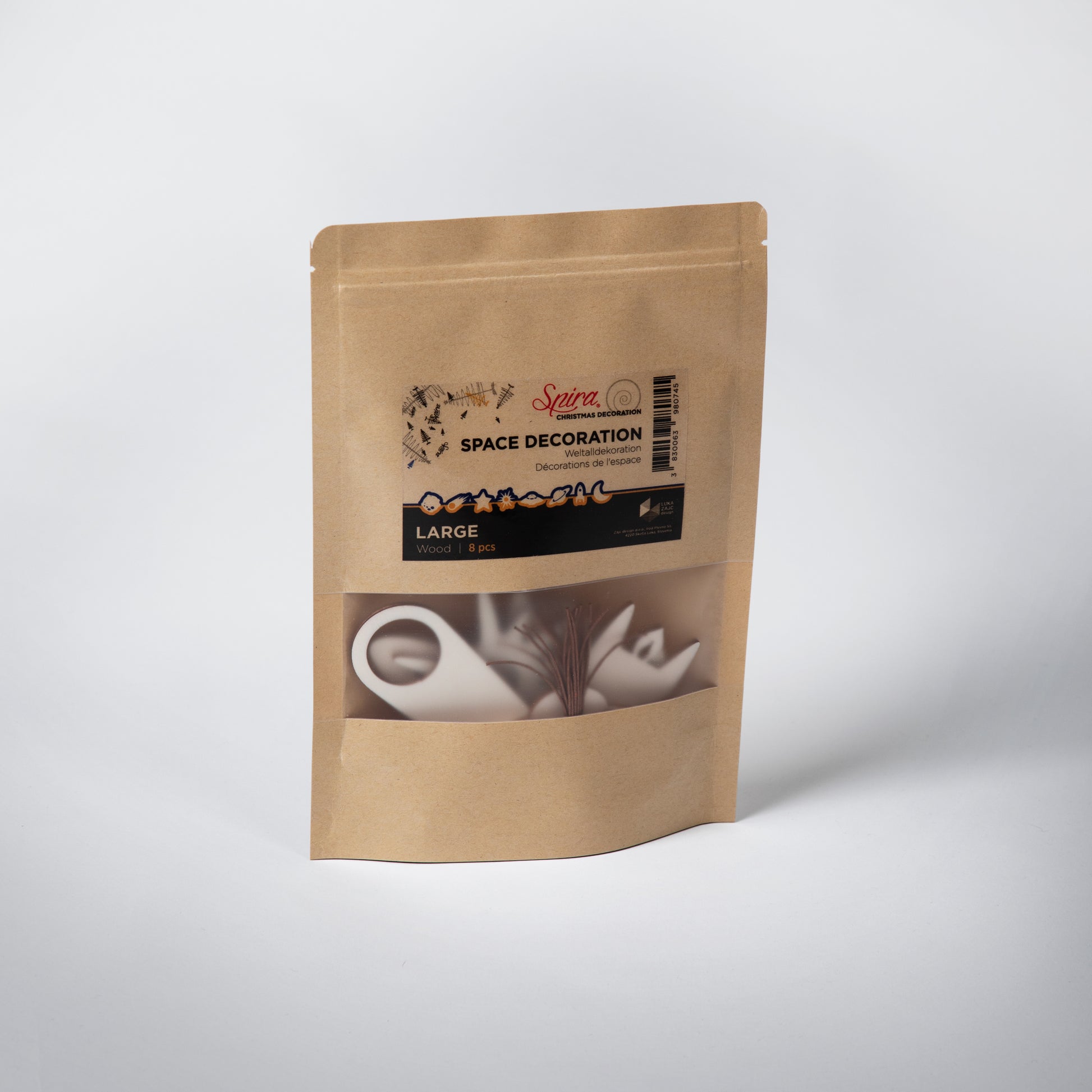 Setti sisältää 8 huopa-ornamenttia avaruusaiheisina. Koristeja on saatavana kolmessa eri koossa. Setti sisältää myös narut koristeiden ripustamiseen.